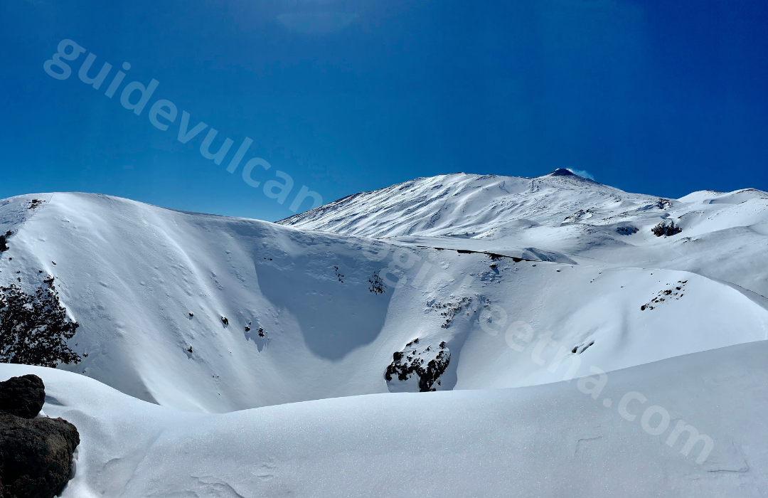 Der Ausflug beginnt in Piano Provenzana (1800 m) auf der Nordseite des Ätna und führt durch schneebedeckte Wälder und alte Lavaströme. Nach einer kurzen Einführung begeben wir uns auf einen schneebedeckten Weg, der uns zu den Kratern von 2002 führt.